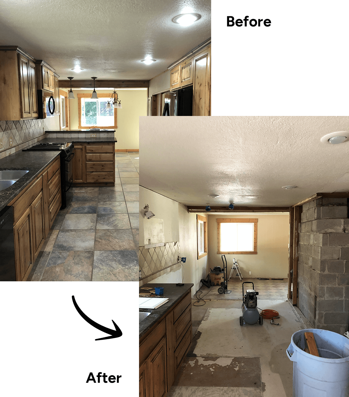 Projects scope: Cabinet, tile floor, drywall, and fireplace removal and haul away. Preparation for kitchen/living renovation.